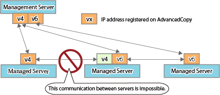 If a Managed Server with IPv4 IP address and a Managed Server with IPv6 IP address are registered on AdvancedCopy Manager with IPv6 address, the range in which communication is allowed is as follows: