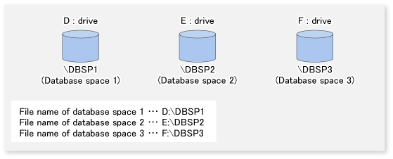AdvancedCopy Manager copies the data in units of volumes (partitions). Therefore, it is required to have exactly one database space file for each volume (partition). Assign a drive letter to the volume, and create only one database space file for the entire partition space. For information on how to create database space in a file system, refer to the Symfoware Server RDB Operation Guide and the Symfoware Server SQL Reference Guide.