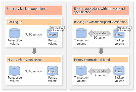 Even when the history information created during backup operations with the suspend specification is deleted, an associated EC session is not released.