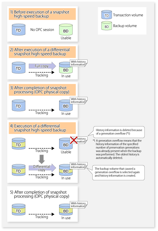 After history information is deleted in a differential snapshot high-speed backup, the backup volume is put into the tracking state without history information. If a new differential snapshot high-speed backup is started under that condition, the backup volume in the tracking state without history information is selected to start the differential data copy. The physical copy can thus be completed in a short period because only the difference in data from where OPC was started previously is copied.