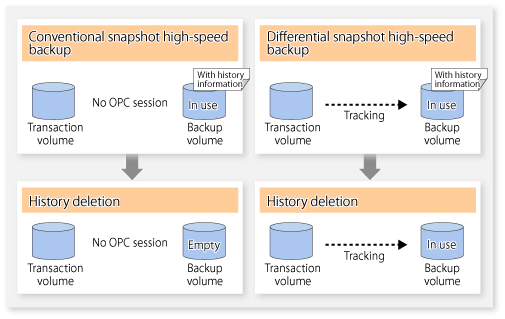 The figure below shows a comparison of history deletion between the conventional snapshot high-speed backup and the differential snapshot high-speed backup.