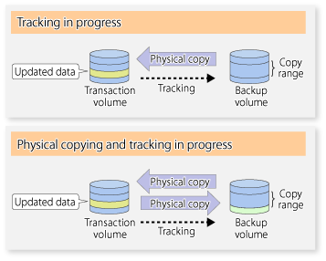 When restoration is executed, normal OPC from the backup volume to the transaction volume is started while the tracking state from the transaction volume to the backup volume is maintained.