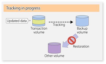 While tracking processing is performed between the transaction volume and backup volume, restoration to other volumes cannot be performed. If restoration to other volumes is required, the following operational steps must be performed in advance: