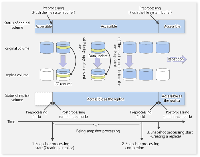 Snapshot replication is completed when the replication creation command is issued. During snapshot processing performed internally by the ETERNUS Disk storage system, if there is an attempt to access an area where copying is not yet complete at the replication destination, priority is given to copying the accessed area and, after it is copied, access is permitted ((a) in the figure).