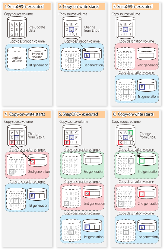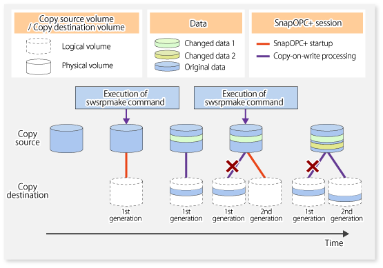 When data is changed, the SnapOPC+ function copies only the original data of the changed data set, and saves it in snap generation units.