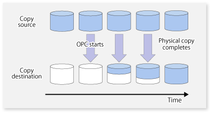 When a copy is created, the snapshot processing (OPC) from the source volume to the replica volume is executed with the swsrpmake command.