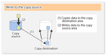 If there is an attempt to update the replication source data, the pre-update data at the replication source is first copied to the replication destination, and then the replication source data is updated ((b) in the figure).