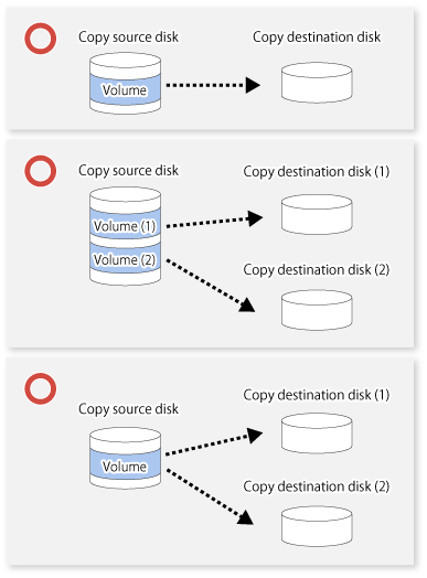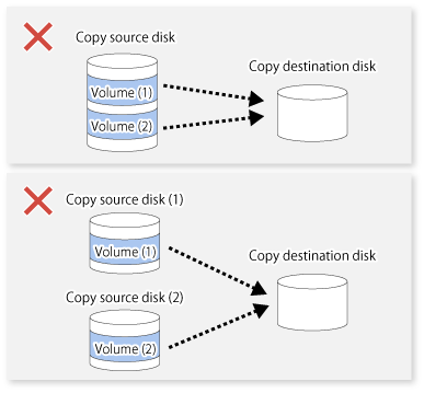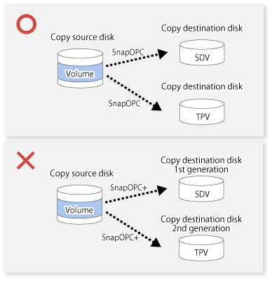 For a SnapOPC copy source disk, you can set the session mixed with an SDV copy destination disk and a TPV/FTV copy destination disk. However, for a SnapOPC+ copy source disk, that session cannot be set.