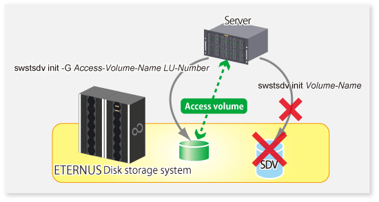 Create the volume that is used as the Access volume in the ETERNUS Disk storage system that the SDV has been created. Since the Access volume is not used in the storage of data, there is no problem even if there is little capacity. Any size can be used for the creation of the Access volume.