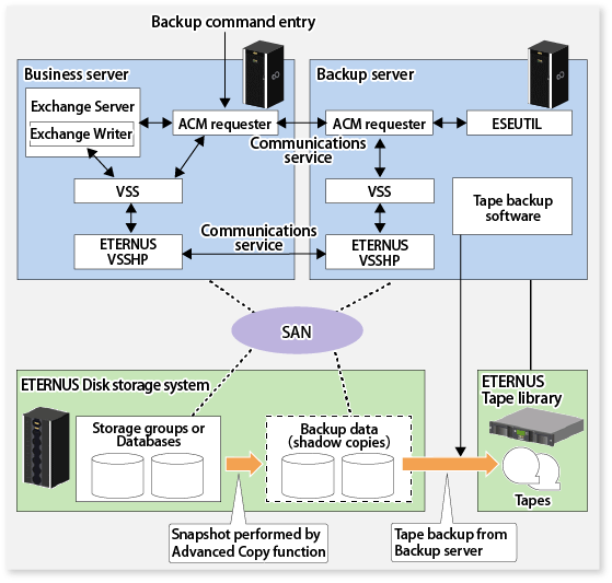 The Advanced Copy function of the ETERNUS Disk storage system can link with VSS to implement a high-speed online backup of the Exchange Server databases.