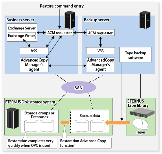 The Advanced Copy function of the ETERNUS Disk storage system can link with VSS to restore the Exchange Server databases from the online backup data.