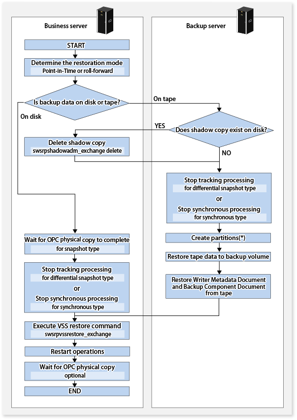 When data backed up to tape is to be restored, the backup data on the tape first needs to be restored on the backup server and then the Exchange VSS restore command needs to be entered.
