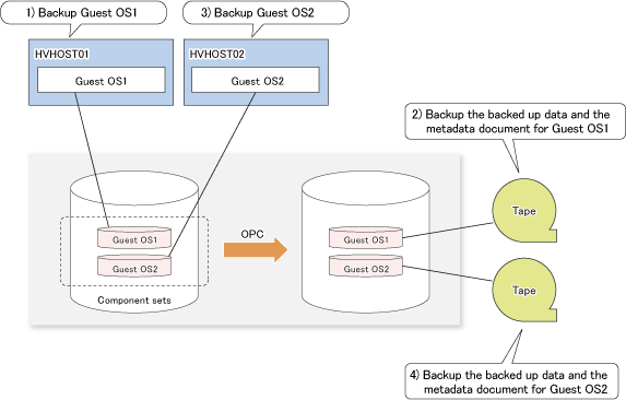 This example explains how to back up both "Guest OS1" and "Guest OS2" under the condition that two Guest OSs ("Guest OS1" and "Guest OS2") are running on the command execution server.