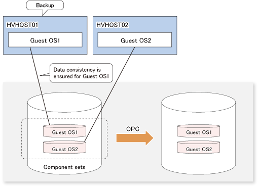 As in the diagram below, when executing backup with the HVHOST01, data consistency for only the guest OS1 is assured. The guest OS2 is not covered for VSS backup, so although file copying is executed, data consistency is not assured.