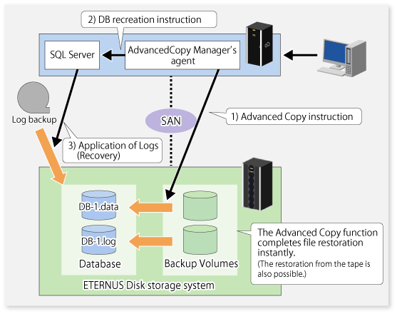 The SQL Server restore execution command recreates a database using the database files restored from a database backup. The following series of processes can be completed in a short time by using OPC of the Advanced Copy function: