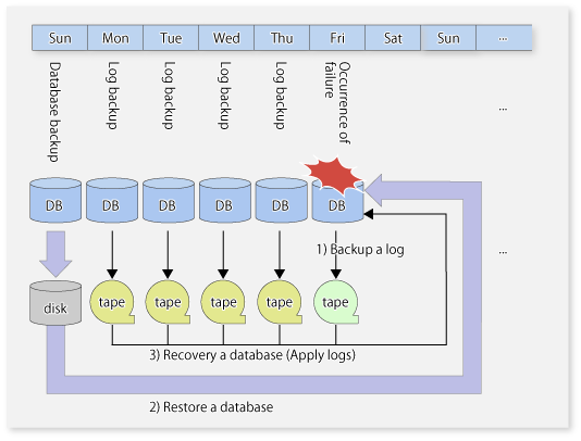 Using the "Figure 10.2 Example of Backup Operation", the diagram below shows how to perform restore up to the latest point when a failure occurs before the log backup on Friday: