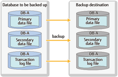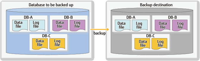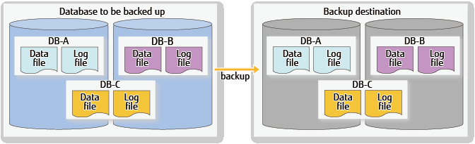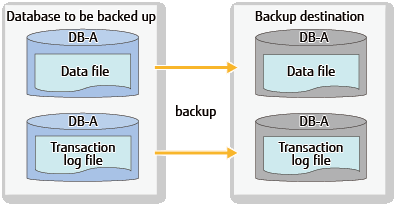Backups are made for data files and transaction logs necessary for recovery in units of databases. With this, it is possible to perform recovery to the point when full backup has been completed.