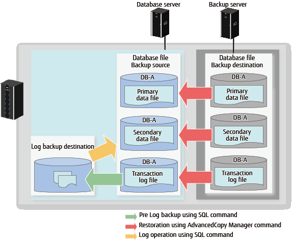 The transaction log is backed up. By performing log backup, it is possible to perform recovery to a point in time immediately prior to the failure. In addition, when log backup is performed, the transaction logs of completed transactions are deleted (disposal of logs).This prevents the log file from becoming excessively large. The backup destination is the file system region (NTFS or ReFS (see Note)) on the Managed Server (Database server).