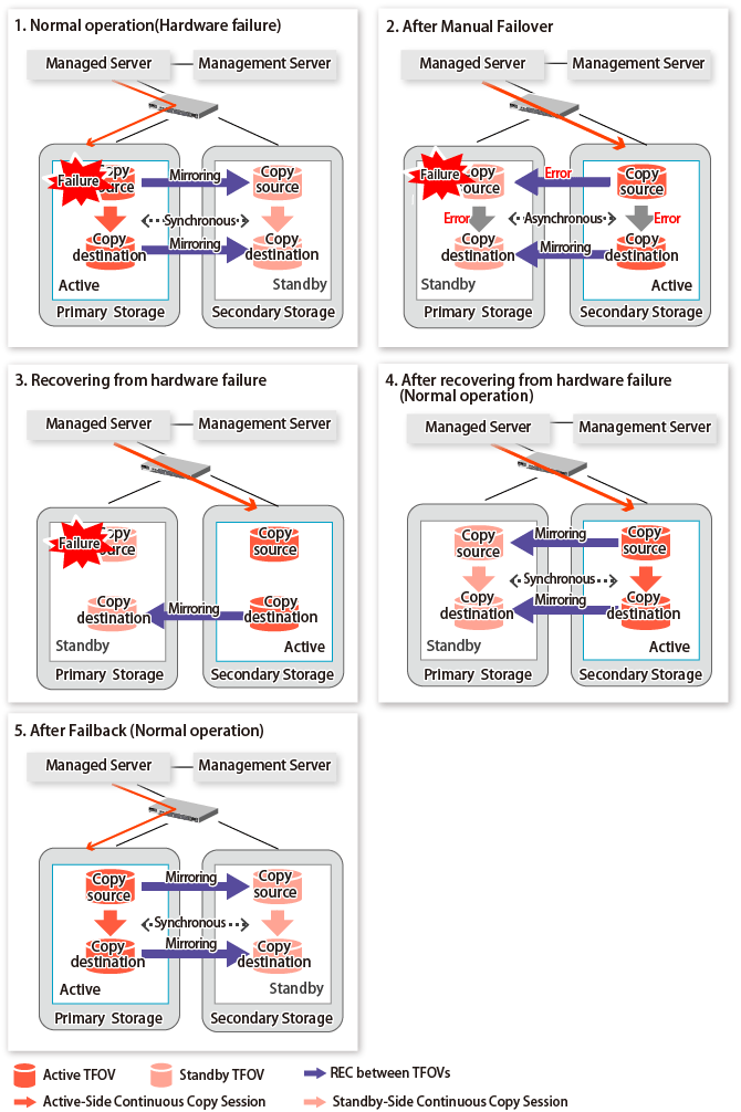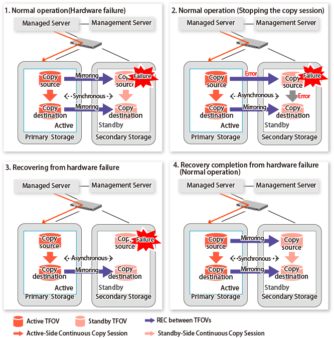 For cases other than those above, since Advanced Copy cannot continue on a storage device where the TFO status is "Standby" only, the Primary Storage and Secondary Storage session states transitions to Error Suspend. When sessions for both the Primary Storage and Secondary Storage have transitioned to Error Suspend, stop both sessions.