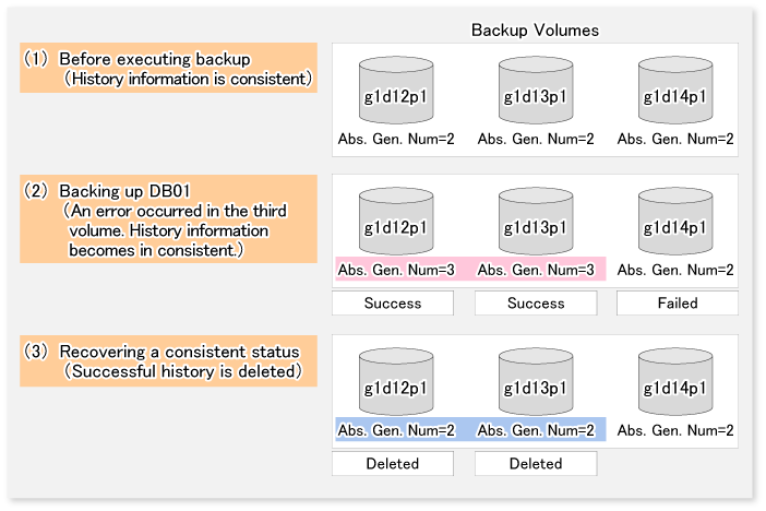 If an error occurs while swstbackup_sqlsvr (SQL Server backup execution command) is processing the database consisting of two or more volumes with the swstbackup command, the backup history information on AdvancedCopy Manager may become inconsistent. In order to recover from such an inconsistent state, delete unnecessary history information using the swsthistdel command.