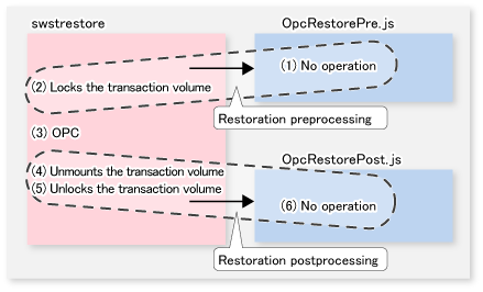 The backup volume is locked/unlocked not by the script but by the command. Therefore, the restoration pre-processing and post-processing scripts are executed immediately before and after the backup volume is locked/unlocked.