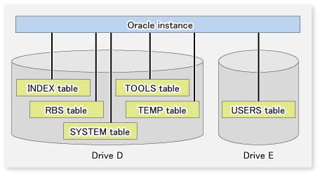 Figure B.1 Relationship Between Oracle Instance and Data Files in Drive Table Spaces (For This Sample Script)
