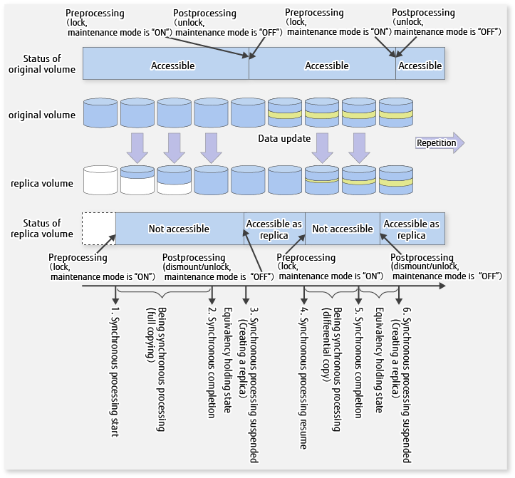 Replication source volume | Pre-processing | Default operation: The file system buffer of the partition included in the Logical Unit (disk) is flushed. When the -Xflush option is not specified and BufferFlushOnly is set to off: In the case of WSFC operation, turn the maintenance mode of the physical disk resource to which the replication source volume belongs ON (only when the maintenance mode is off prior to execution of the replication). The partition included in the Logical Unit (disk) is locked. When the -f option is specified: No processing is performed (i.e., the source pre-processing script is not executed).