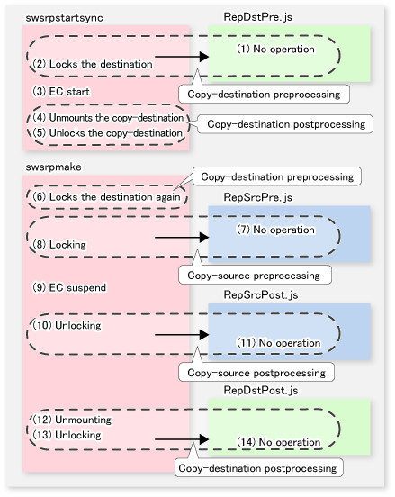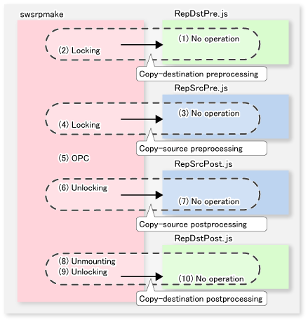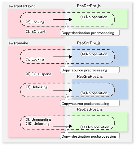 The volume is locked/unlocked, and the buffer is flushed by the command, not by the script. Therefore, the source pre-processing and post-processing scripts are executed immediately before and after (respectively) the source/destination volumes are locked/unlocked and the buffer is flushed. The source/destination pre-processing and post-processing scripts do not perform any processing.
