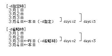-dで指定した日付を最終日として、本オプションで指定した日数分の性能情報をCSV出力します。本オプションを省略すると1が指定されたものと見なします。0を指定するとエラーになります。以下に例を示します。