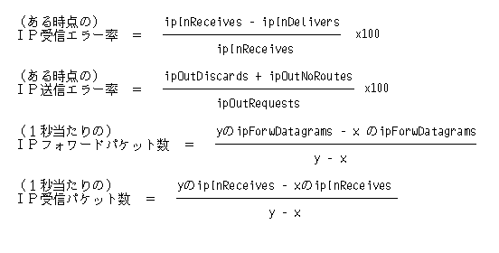 管理対象ノード全体のIP層でのある時点の送受信エラー率、ある時刻xから時刻yでの1秒当たりのフォワード量、受信量は以下の計算式で把握できます。