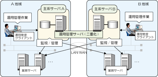同じ機能を持つ複数の運用管理サーバを設置し、それぞれで運用管理作業を行うシステム構成です。クラスタや連携型が、同一サイト内での運用管理サーバの可用性を高める目的で利用するのに対して、災害などにそなえて分散した地域で、同時に監視することができます。