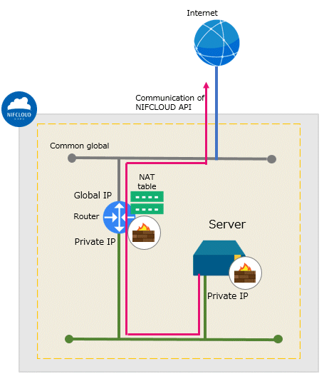 Ensuring connectivity with the router | Ensuring low cost and secure connectivity of back-end servers | Operation management is not required by the user since the NAT function provided by the router of NIFCLOUD is used. |