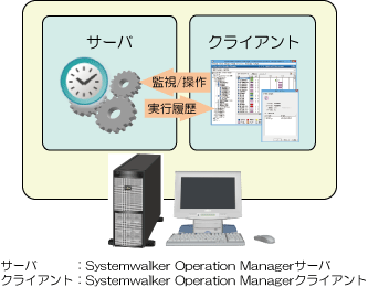 Systemwalker Operation Managerは、サーバ機能とクライアント機能で構成されています。サーバ機能は業務の自動運用を行い、クライアント機能は、サーバに接続して、定義や監視/操作などを可能とするユーザーインタフェースを提供します。