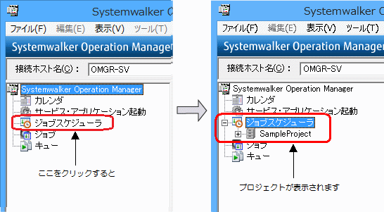ジョブスケジューラ機能を例に、ツリー構造の展開方法を説明します。