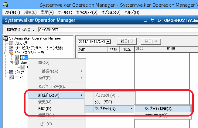 右クリックで、ポップアップメニューの[新規作成]から[ジョブネット]-[ジョブ実行制御]を選択します。