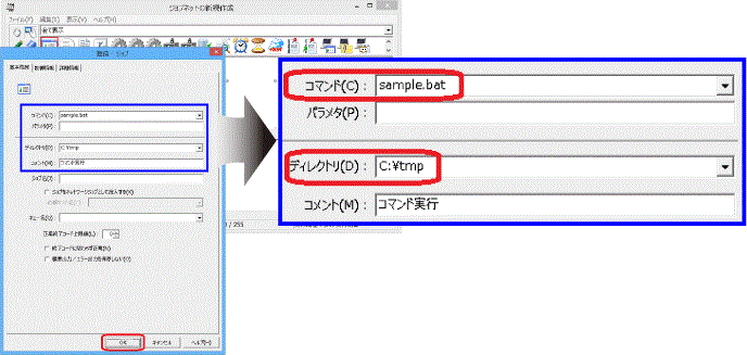 [基本情報]シートの[コマンド]に“sample.bat”、[ディレクトリ]に“c:\tmp”(コマンドが格納されているフォルダ名)を入力します。