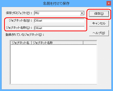 [名前をつけて保存]ウィンドウが表示されます。[ジョブネット名]に“OKnet”と入力します。このとき、[ジョブネット名称]にも同様の文字列が入力された状態になります。