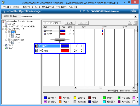 [ガントチャート]ウィンドウが表示され、状態の色により“OKnet”ジョブネットが正常終了し、“NGnet”ジョブネットが異常終了していることが確認できます。