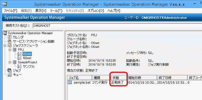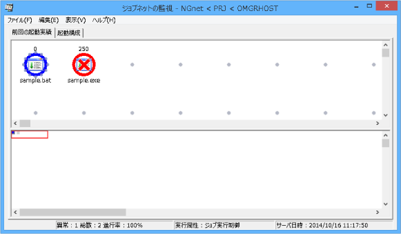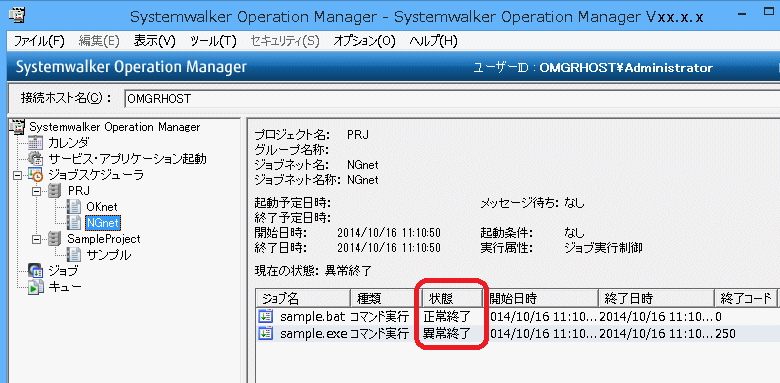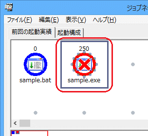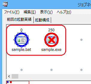 “sample.bat”ジョブが正常終了し、“sample.exe”ジョブが異常終了していることが確認できます。