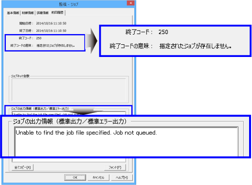 以下の例では、異常終了した原因は、設定したジョブ(コマンド)が存在しないためであることがわかります。
