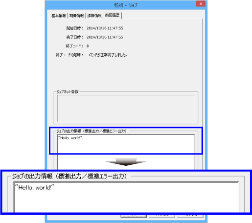 なお、正常終了した“sample.bat”の[前回履歴]シートでは、[ジョブの出力情報(標準出力/標準エラー出力)]に、コマンド内において“echo”で指定した文字列が出力されています。