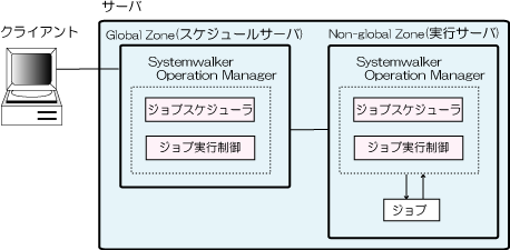ジョブ実行制御のネットワークジョブ機能を利用して、Global Zoneをジョブのスケジュール管理専用として利用し、Non-global Zoneをジョブの実行専用として利用する形態です。