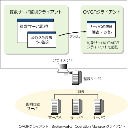 クライアント上では、複数サーバ監視クライアントのウィンドウで全体の監視を行いながら、同時に各監視対象サーバへ接続したSystemwalker Operation Managerクライアントのウィンドウで調査または対処を行うことができます。