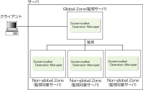 Systemwalker Operation Managerは、1つのZoneを1つのサーバとみなして動作します。Zoneに割り当てた論理IPアドレスにより、複数のZone内で動作しているジョブスケジューラデーモンをまとめて監視できます。