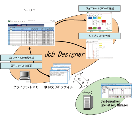 Job Designerを利用すると、ジョブネットやジョブを定義する時の制御文をMicrosoft(R) Excelのワークシートを使って簡単に編集することができます。