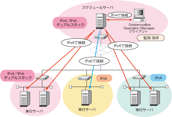 IPv4およびIPv6通信環境上で動作するマシンに、Systemwalker Operation Managerを導入して、業務を運用することができます。IPv4/IPv6が混在する環境においても、同様にSystemwalker Operation Managerを利用することができます。