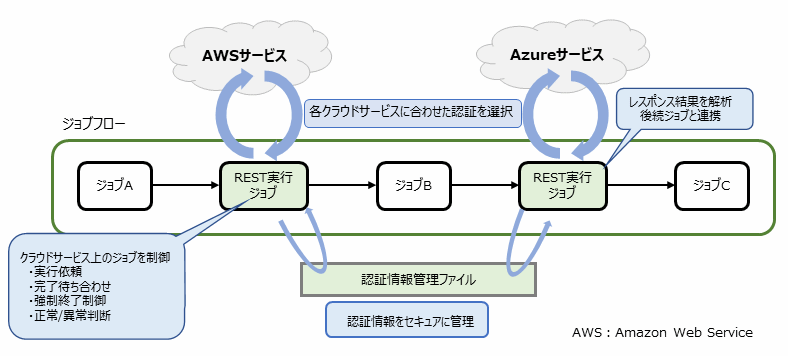 REST実行ジョブの利用により、RESTインタフェースが提供されているクラウドサービスのAPIを実行できます。