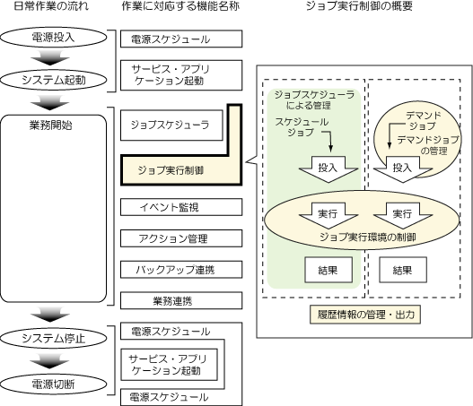 ジョブ実行制御は、ジョブの実行から終了までを効率的に制御し、実行履歴の情報を管理、出力します。