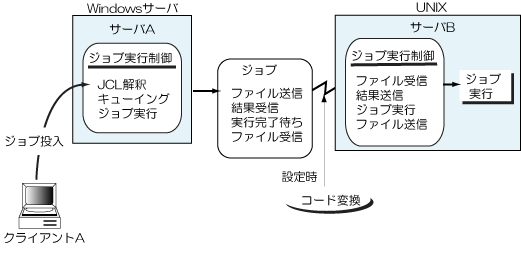 コード体系の異なるサーバ間でネットワークジョブを実行する場合は、コード変換機能を利用して、コードを変換することができます。ジョブファイル、標準出力ファイルおよび標準エラー出力ファイルのコードを変換(改行コードの変換を含む)します。