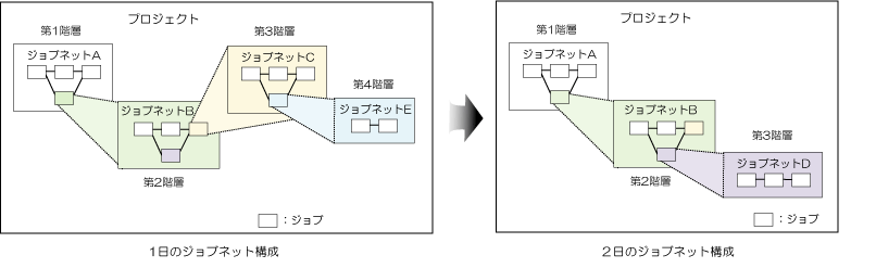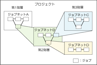 ジョブネットの中に別のジョブネットをジョブとして登録することができます。ジョブネットの中にジョブネットを登録することを“ジョブネットの階層化”と呼びます。別のジョブネットを登録しているジョブネットを“親ジョブネット”、ジョブネットに登録されているジョブネットを“子ジョブネット”と呼びます。また、階層化されているジョブネットにおいて、階層の深さを“第N階層”と表現します。ジョブネットは、第5階層まで階層化することができます。